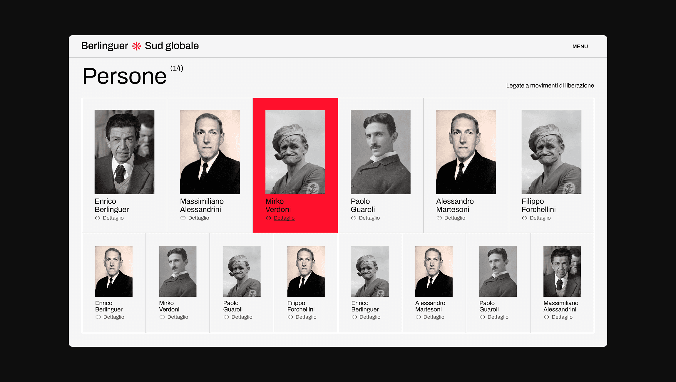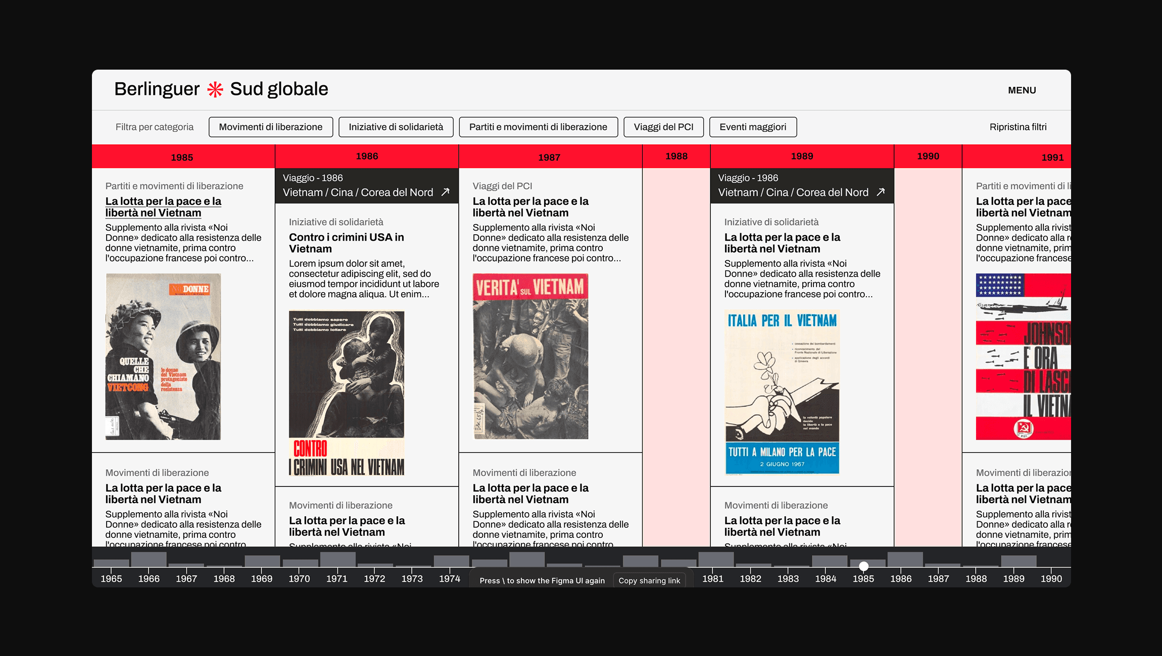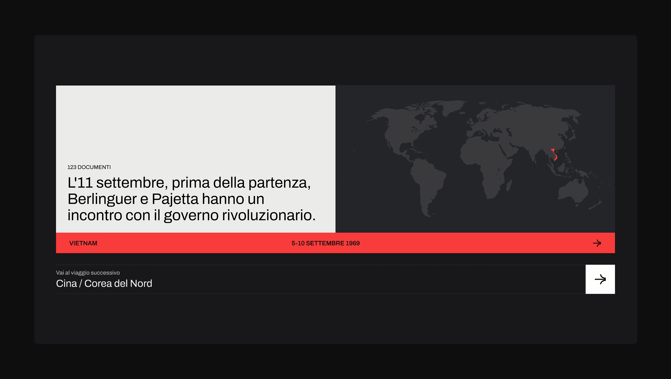 The approach focused on creating an archive visually aligned with a brutalist aesthetic, reflecting the political message of the site, and on presenting the documents and timeline in a simple and intuitive way. The website is designed for a wide range of users, all united by the desire to explore documents and files related to Berlinguer’s life and his travels.