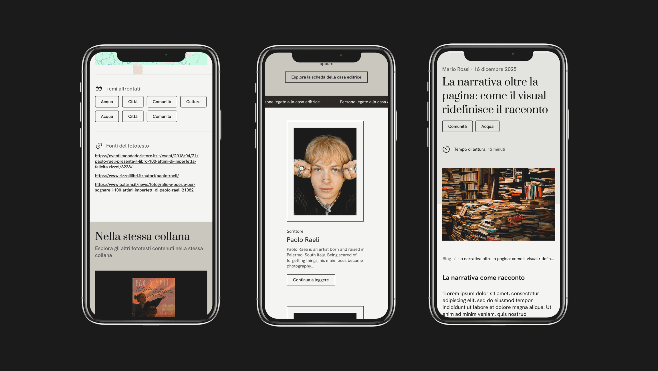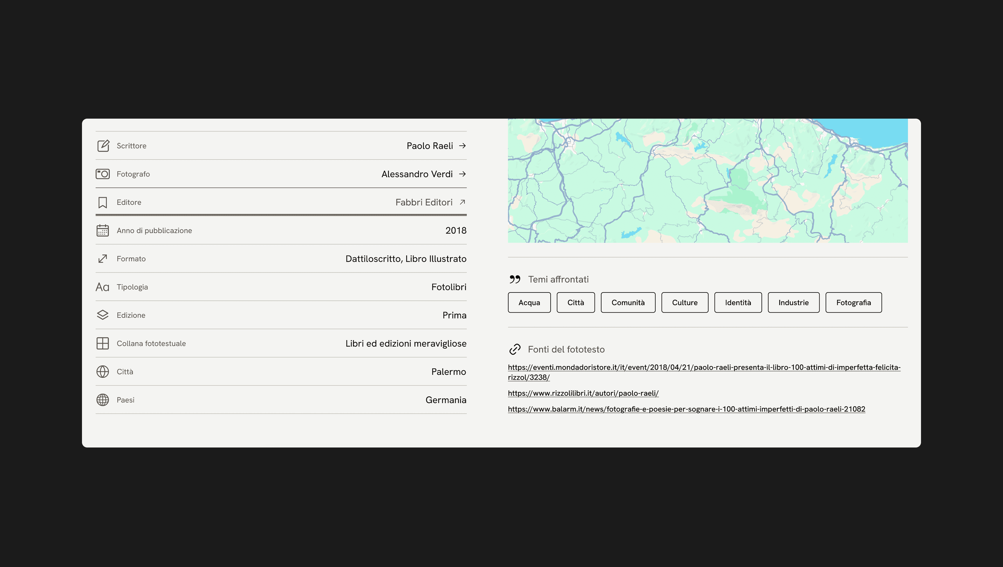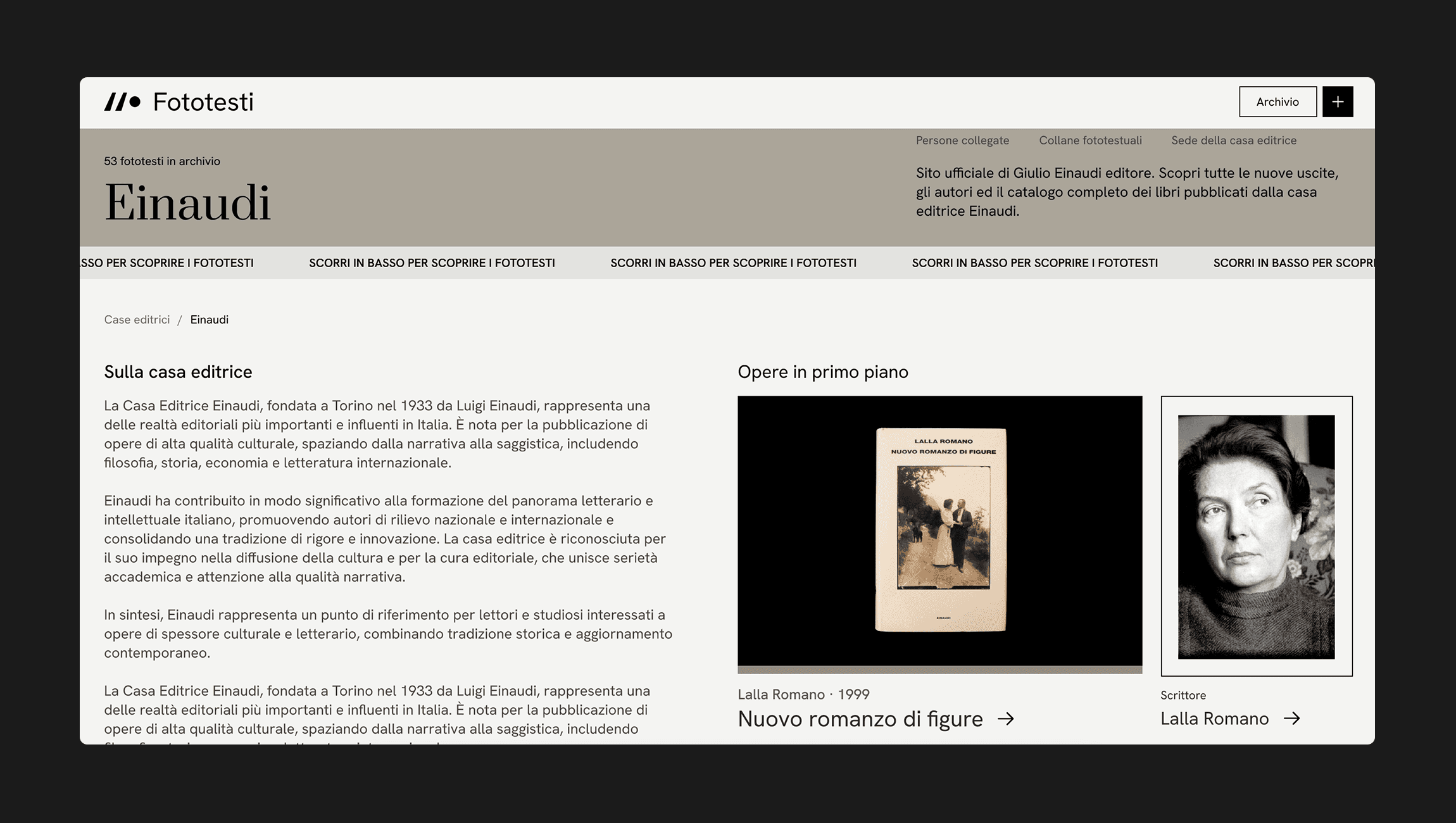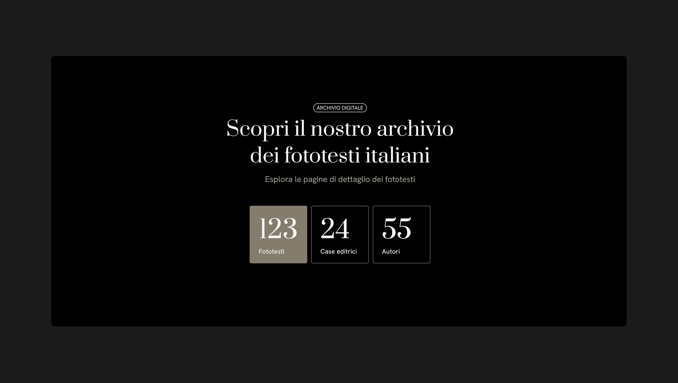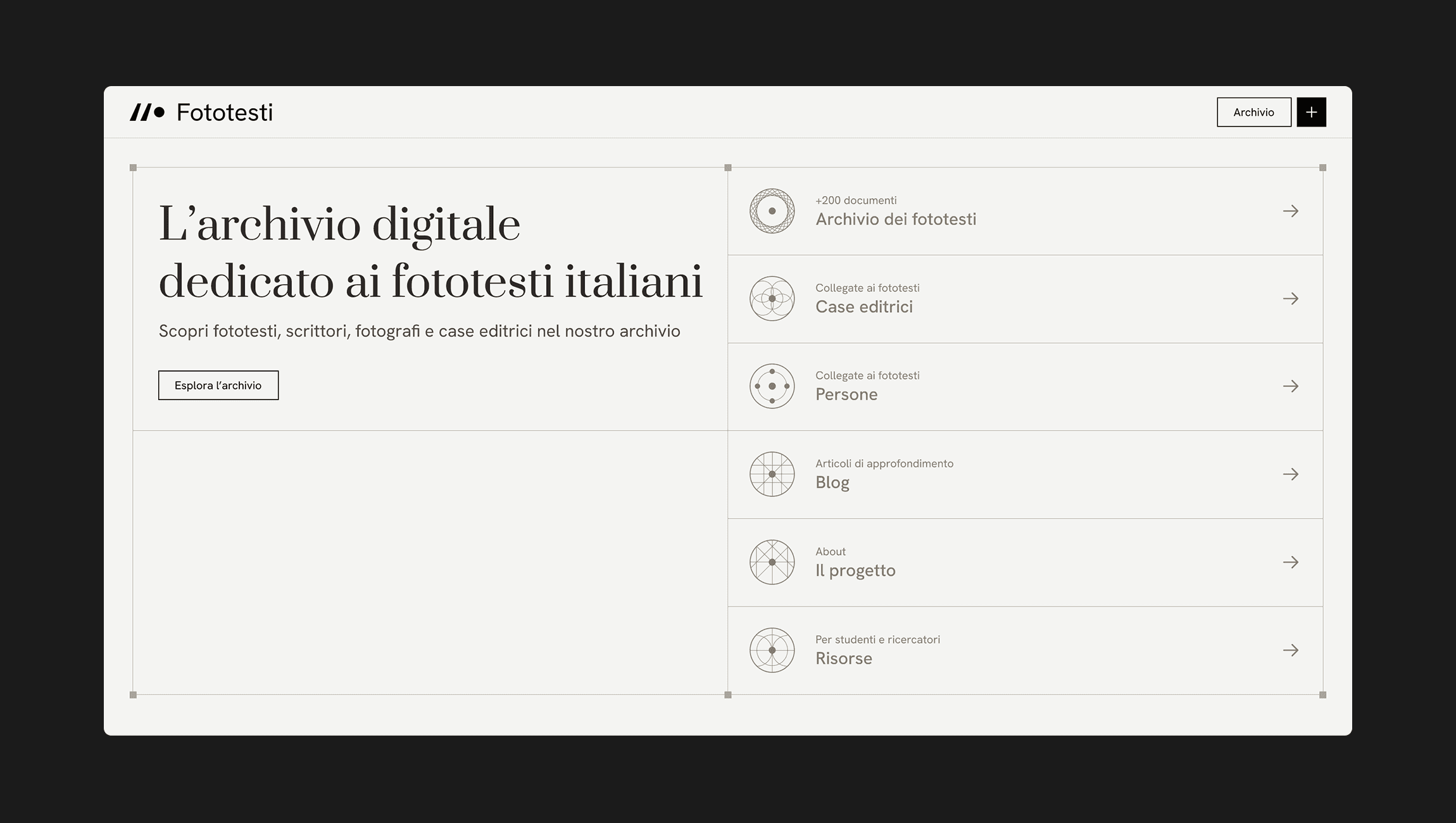 The project aimed to create a digital archive accessible to researchers and students, allowing open consultation and the discovery of new Italian phototexts. The design draws inspiration from the aesthetics of print media and, more broadly, the editorial world, maintaining a clean and elegant approach. Usability was optimized to ensure an intuitive experience, with particular attention to the connections between different entities and ease of navigation.