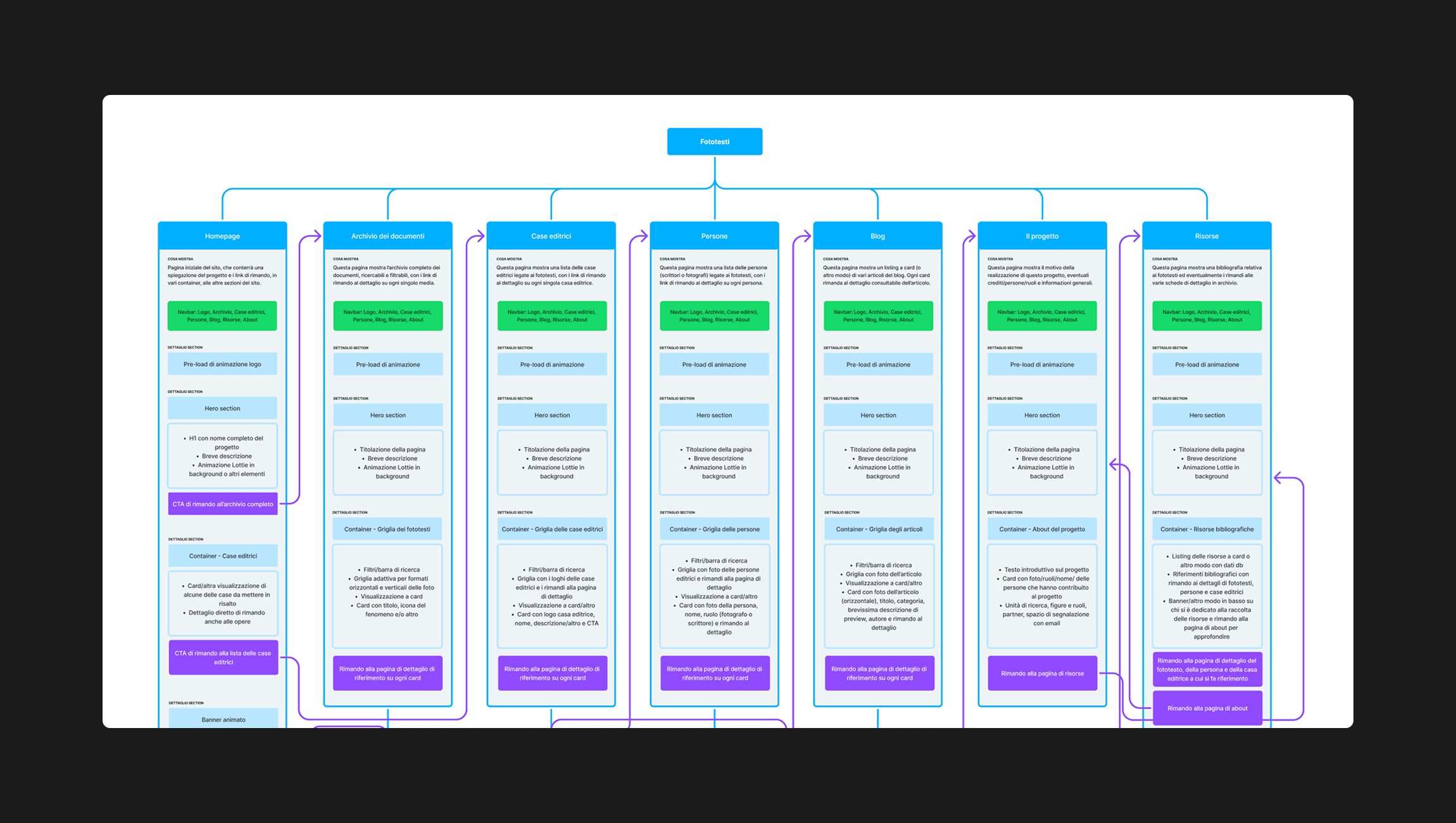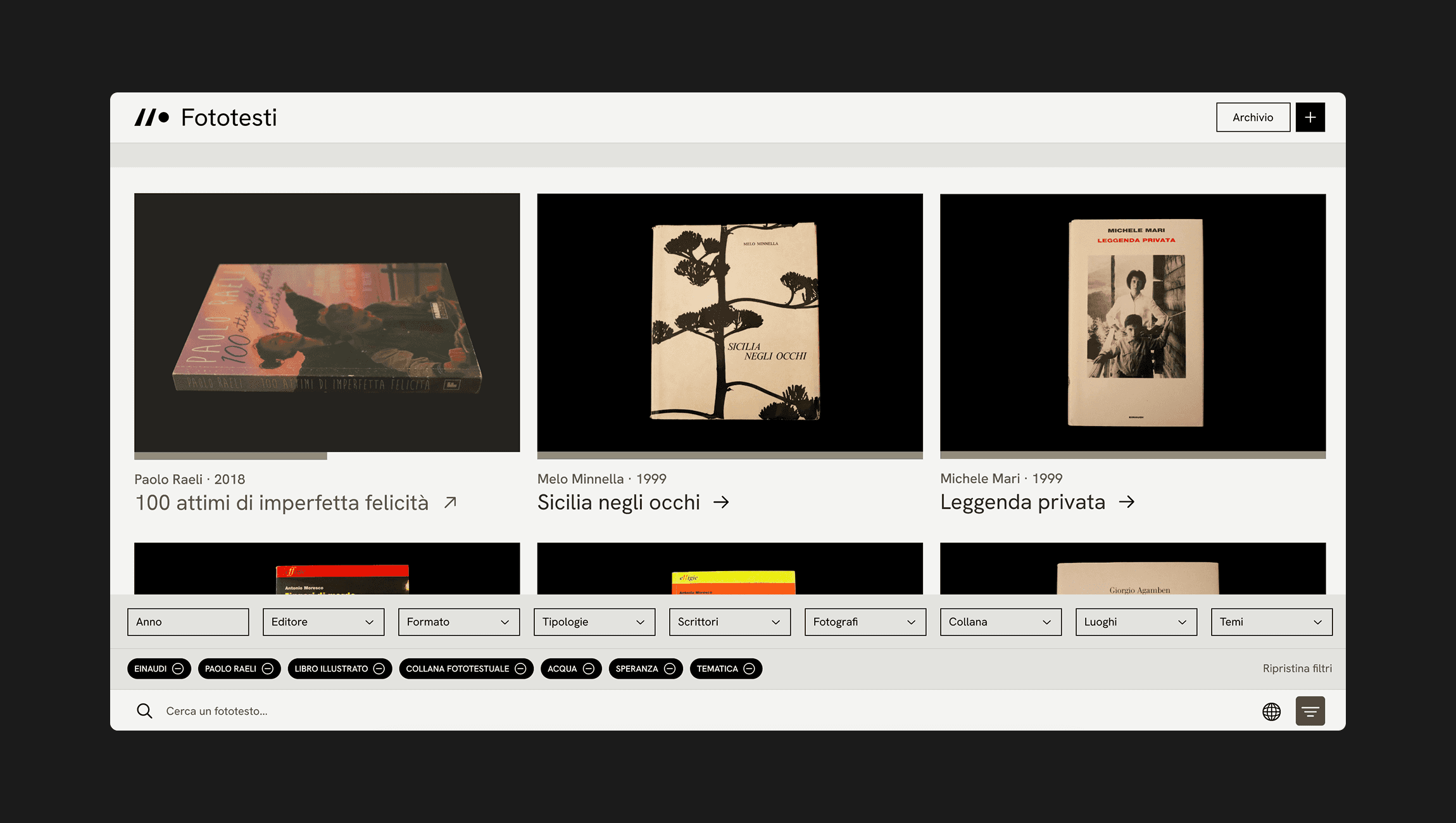 The Fototesti Italiani website aims to gather a wide range of Italian phototests into a single digital archive, organized to be easily accessible to users from a visual perspective. The goal is to make the archive easy to navigate and ensure that all entities (technical data, authors, photographers, tags, locations, and metadata) are interconnected.