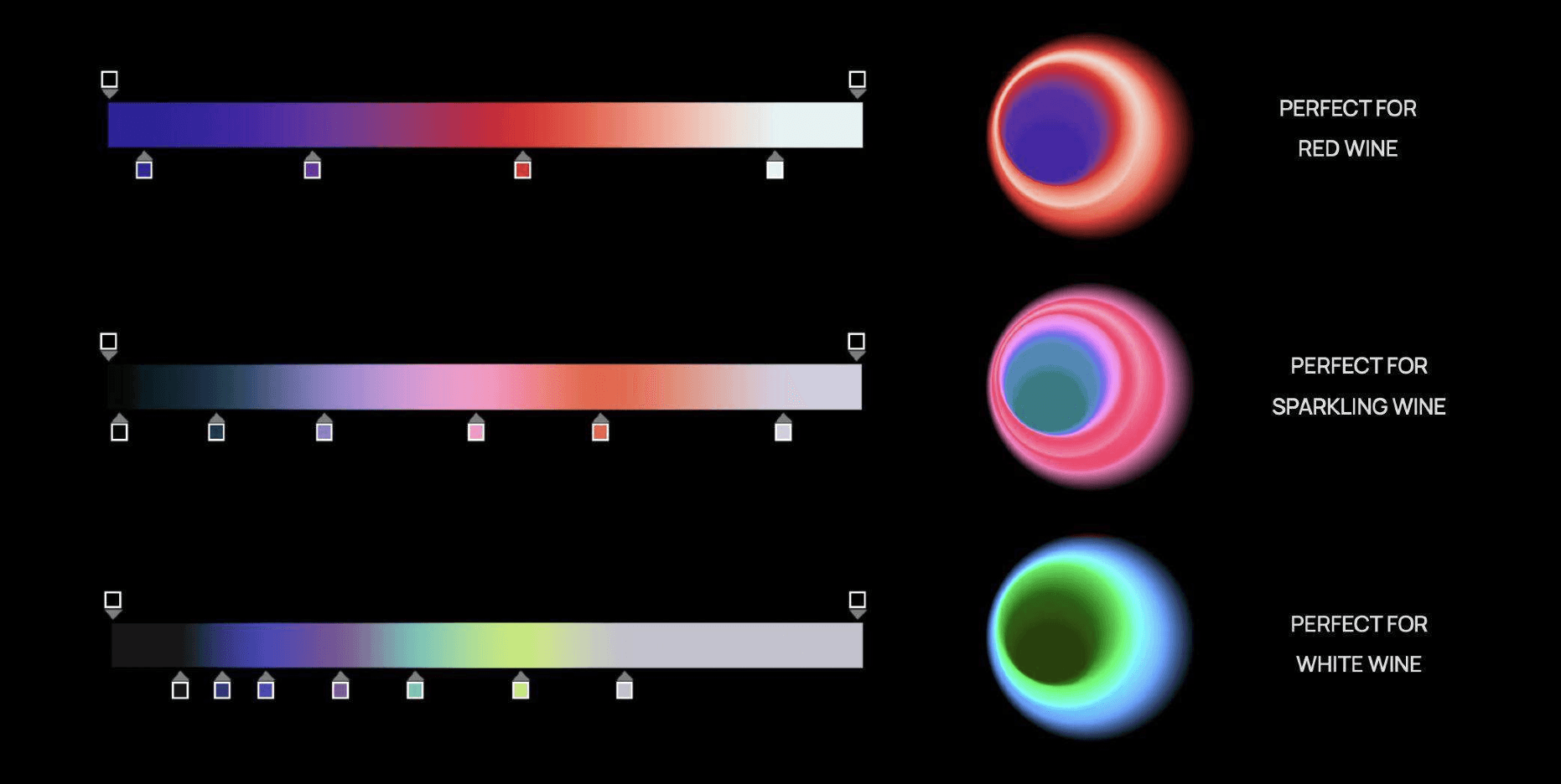 One of the approaches was to focus on the “shades of taste” for the wine labels, combining the idea of flavor nuances with color gradients, each one distinct for a different type of wine.